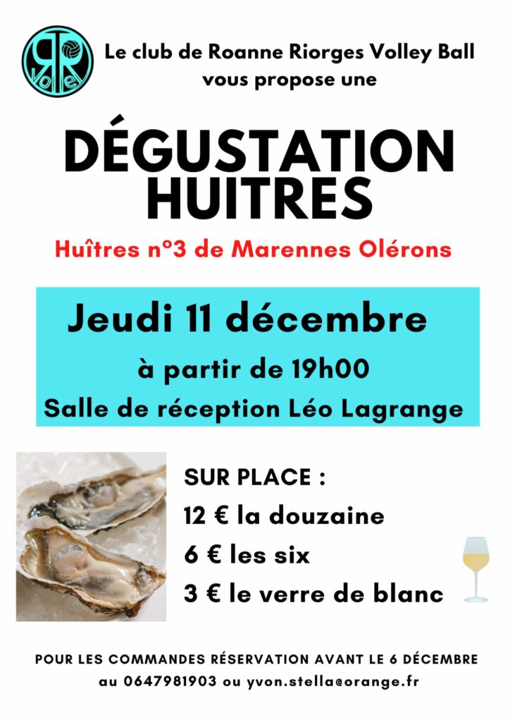 – Dégustation huîtres le Jeudi 11 décembre (attention inscriptions jusqu’au 6 décembre au 0647981903 ou par mail à yvon.stella@orange.fr ) à Léo Lagrange